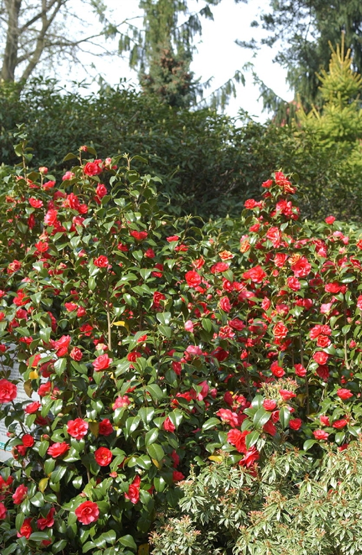 Japanische Kamelie ist ein aufrecht wachsender Strauch, der eine Höhe von 2 - 3 m und eine Breite von 1,5 - 2 m erreichen kann.